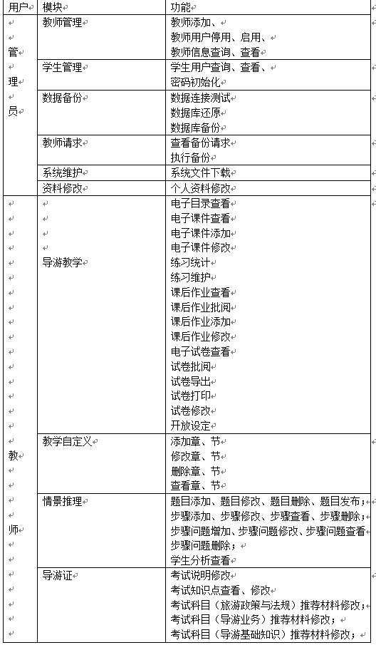 該導(dao)游業務與技能(neng)教(jiao)學軟件在功(gong)能(neng)上,以管理員、教(jiao)師端、學生端三種權限設(she)置(zhi)各自功(gong)能(neng),完全能(neng)滿足旅游業務與機能(neng)教(jiao)學要求。平(ping)臺通過精彩的(de)內容、強大的(de)功(gong)能(neng)、友好的(de)界面(mian),可(ke)靠的(de)性能(neng),實現導(dao)游業務與機能(neng)教(jiao)學的(de)時代性跨越。