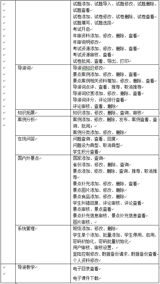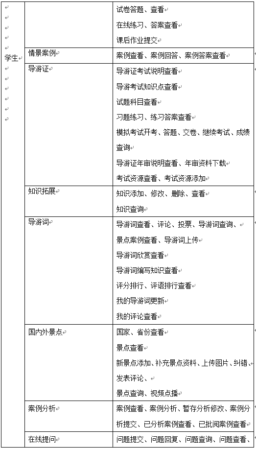 學(xue)(xue)(xue)生(sheng)的主要(yao)功能是(shi)導游(you)教學(xue)(xue)(xue)知(zhi)識的學(xue)(xue)(xue)習(xi)(xi)(xi)、完成(cheng)情景(jing)推理中包含(han)的案例(li)(li)及(ji)題目、導游(you)證考(kao)試學(xue)(xue)(xue)習(xi)(xi)(xi)及(ji)模擬考(kao)試、導游(you)拓展知(zhi)識學(xue)(xue)(xue)習(xi)(xi)(xi),同(tong)時(shi)可(ke)添加新的知(zhi)識供其(qi)他同(tong)學(xue)(xue)(xue)學(xue)(xue)(xue)習(xi)(xi)(xi)、導游(you)詞學(xue)(xue)(xue)習(xi)(xi)(xi)并編寫導游(you)詞、國內外景(jing)點學(xue)(xue)(xue)習(xi)(xi)(xi)、案例(li)(li)分析(xi)和在(zai)線提(ti)問(wen)。