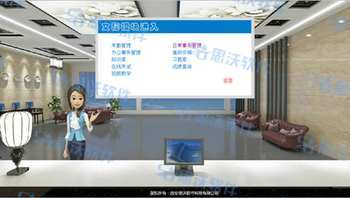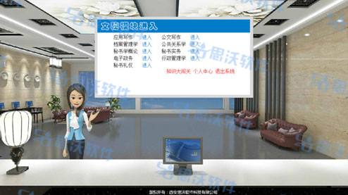 思沃文秘虛(xu)擬仿真實訓系統是我(wo)公(gong)司依據文秘專(zhuan)業相關(guan)課程(cheng),結合3D動態場景(jing)技術,引入實際(ji)文秘工作中的相關(guan)案例,融合開發的一款(kuan)針(zhen)對文秘專(zhuan)業實訓的應用型教(jiao)學平臺軟(ruan)件。